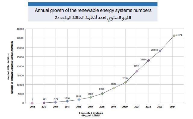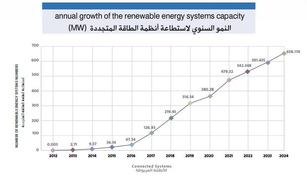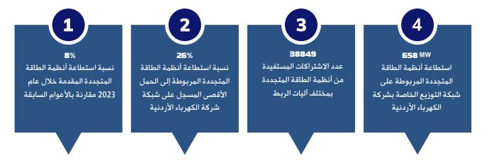 وقد بلغ عدد نظم مصادر الطاقة المتجددة المربوطة نهاية هذا العام، والنظم التي حصلت على تصاريح أولية، وموافقة أولية أو نهائية منذ البدء في تطبيق التعليمات ذات العلاقة في العام 2012 حوالي (39,412) نظام باستطاعة تقارب (951.5) ميجا واط، أي ما يعادلٍ %37 من الحملٍ الأقصى المسجلٍ على شبكة التوزيع التابعة للشركة في هذا العام، رُبط منها ما يزيد على (34) ألف نظام باستطاعة إجمالية تقارب (658) ميجا واط أي ما يعادلٍ %26 من الحملٍ الأقصى المسجلٍ على شبكة التوزيع التابعة للشركة في العام 2024،
