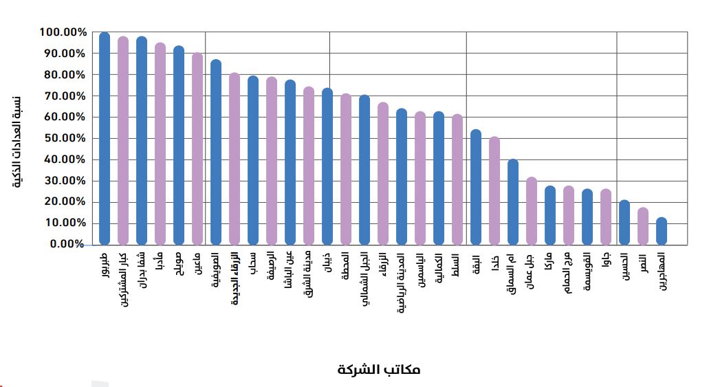 تابعت الشركة في هذا العام تنفيذ مشروع العدادات الذكية، اذ قامت كوادر الشركة بتركيب واستبدال ما مجموعه (470,406) عداداً جديداً ليصبح العدد الاجمالي للعدادات الذكية في الشركة (943,519) عداد توزعت على جميع مكاتب الشركة، وبلغت نسبتها من اجمالي عدادات الشركة (59%) حتى نهاية عام 2024.