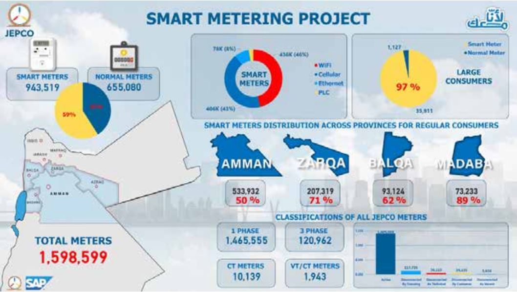 كمــا شــهد هذا العــام التحضير للمرحلــة الثانيــة من مشروع الـعدادات الذكيـة، والتـي تـهدف الـى التكاملٍ مــع انظمــة الشركــة المختلفــة ، بمــا فــي ذلك نظــام الــفوترة وخدمــات المشتركين (SAP)، ونظــام تخطيط الشبكــة الكهربائيــة (SINCAL) ونظــام المعلومـات الجغرافيـة (GIS) ، الـى جـانب باقـي الانظمـة التشـغيلية الاخرى ، بمـا يسـهم فـي تـعزيز كفـاءة العمليــات وتطوير البنيــة التحتيــة الرقيمــة للشركــة .
